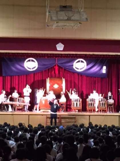 10月14日、土曜授業で音楽鑑賞会を行いました。和太鼓の演奏は、講堂のドアが揺れるほどの迫力でした。楽しいお話や演出もあり、子どもたちは、和太鼓や琴、津軽三味線、篠笛などの音色を楽しむことができました。最後には、児童各学年代表2名、計12名による即興の演奏で盛り上がりました。