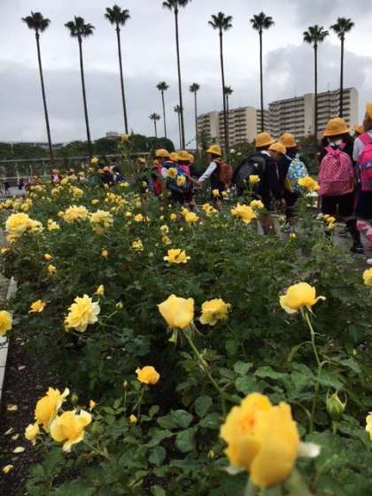雨が降ってきたので、屋根の下でお弁当を食べました。その後雨のあがっている間に、植物園を見学しました。