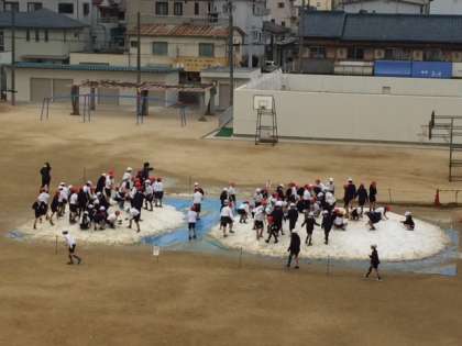 平野区ゆきまつりで使用した雪が運動場に残っています。本日は、少しの時間ですがクラスや学年で授業中に雪で遊びました。昨日のようなふかふかの雪ではなく、かたまった氷のような雪になってしまっていましたが、子どもたちは、雪の感触や冷たさを楽しんでいました。