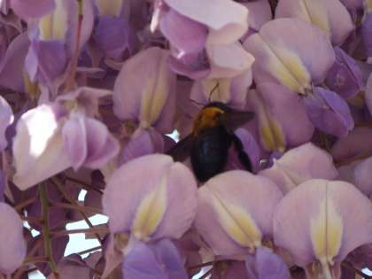 4月10日(火)運動場の藤棚にきれいに藤の花が咲いています。暖かな日差しを浴びてきれいに咲いています。そしてその藤の花にミツバチでしょうか、おいしそうに蜜を吸っているようです。