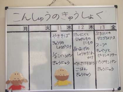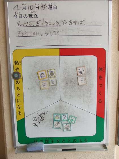 4月11日(金)給食調理室に掲示されているメニュー表です。下の写真は児童っが作った献立表、栄養グラフです。