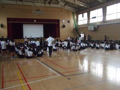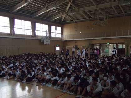 今日はいじめについて考える日です。体育館で児童朝会を行い、絵本「わたしのいもうと」を読み聞かせ、全児童でいじめについて考えました。