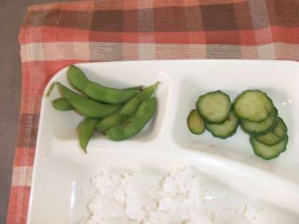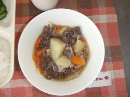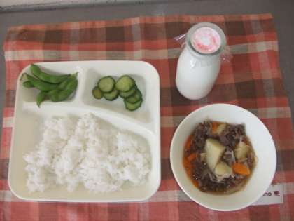 5月7日(月)の給食は肉じゃが、きゅうりのかつお梅風味、枝豆、米飯、牛乳です。肉じゃがはジャガイモがホクホクに柔らかく、ニンジン、玉ねぎ、糸こんにゃくに味がなじみご飯によく合いおいしかったです。きゅうりのかつの梅風味も味が良くなじみ鰹節に梅の風味がし、おいしかったです。どのクラスおかわりの列ができていました。ごちそうさまでした。