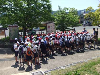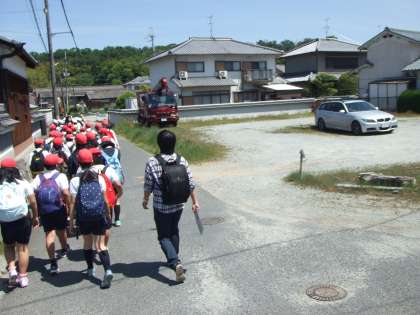5月11日(金)6年生は絶好の五月晴れの元、飛鳥方面に遠足に行きました。歩こうと汗ばむような陽気の中、歩きました。歩いた歩数は「17975歩」でした。電車の中もマナーよく、天気に負けないくらいすばらしい遠足でした。体育館前での出発式の様子と飛鳥に到着した様子です。
