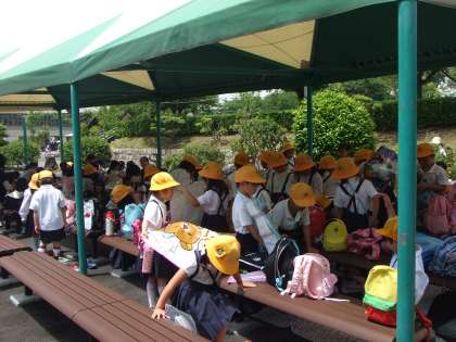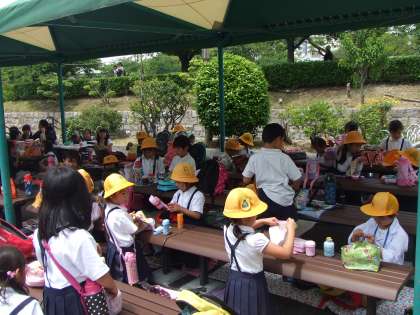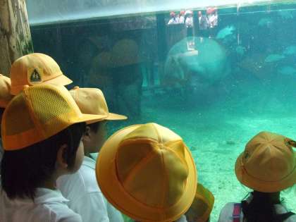 遠足の様子です。向こうに見えるのはカバ?でしょうか。