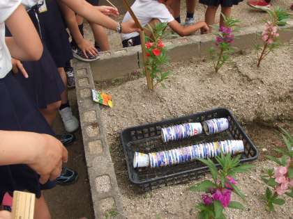 5月28日(月)3年生の理科の授業です。マリーゴールドとホウセンカの長さを図っています。