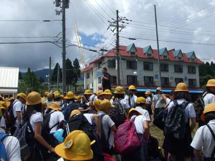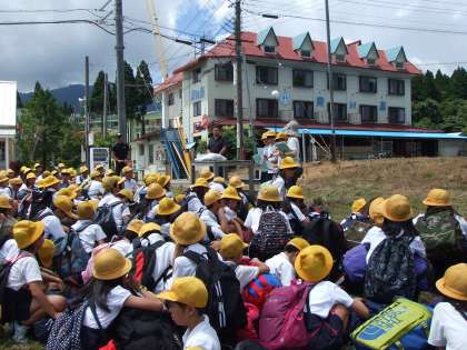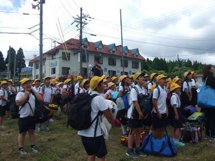 林間学習、写真上は入舎式、写真中はお世話になる青い鳥のご主人からお話を聞いています。写真下は全員で山に向かって「ヤッホー」、遠くから「ヤッホー」とこだましていました。