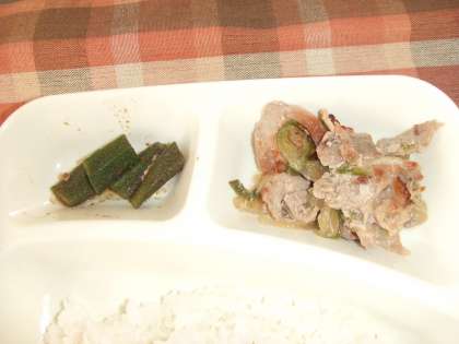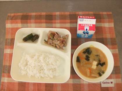 9月5日(水)の給食は豚肉の甘辛焼き、みそ汁、オクラのおかかいため、米飯、牛乳です。豚肉の甘辛焼きは玉ねぎ、ピーマンがはいって甘辛く味付けしてあります。みそ汁はわかめ、、にんじん、キャベツ、えのき、豆腐と具だくさんです。オクラはしょうゆ、みりんなどで甘辛く味付けしてあり鰹節がまぶしてあります。どのおかずもご飯によく合いおいしかったです。ごちそうさまでした。