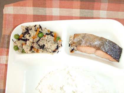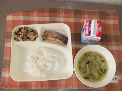 9月10日(月)の給食はさけのしょうゆ風味焼き、五目汁、高野豆腐の炒り煮、米飯、牛乳です。さけのしょうゆ風味焼きは、醤油風味の焼きざけです。五目汁はたけのこ、たまねぎ、キャベツがはいったすまし汁です。高野豆腐の炒り煮はひじき、豚挽き肉、グリーンピース、を高野豆腐と一緒に甘辛く炒っています。どれもご飯によく合っておいしかったです。ごちそうさまでした。