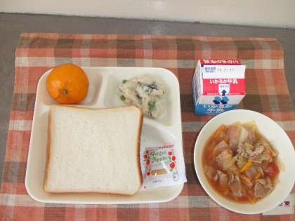 9月12日(水)の給食は豆乳マカロニグラタン(米粉)、トマトスープ、冷凍みかん、パン、牛乳です。豆乳マカロニグラタン(米粉)は鶏肉、たまねぎ、しめじ、上新粉、豆乳が入ったマカロニグラタンです。トマトスープは豚肉、ニンジン、キャベツが入っています。どちらもおいしかったです。冷凍みかんのさわやかな冷たさが口に広がりました。ごちそうさまでした。