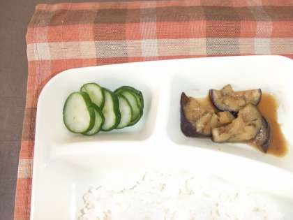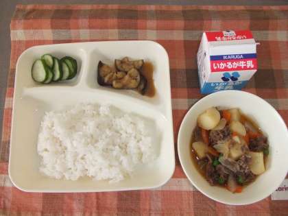 9月13日(木)の給食は肉じゃが、、焼きなすのみそだれかけ、あっさりきゅうり、米飯、牛乳です。肉じゃがはたまねぎ、にんじん、糸こんにゃくに牛肉がたっぷり入っています。焼きなすのみそだれかけ、あっさりきゅうりとどの献立もご飯によく合っておいしかったです。ごちそうさまでした。