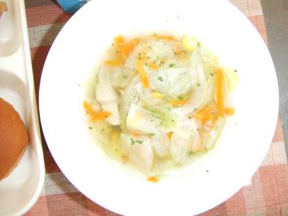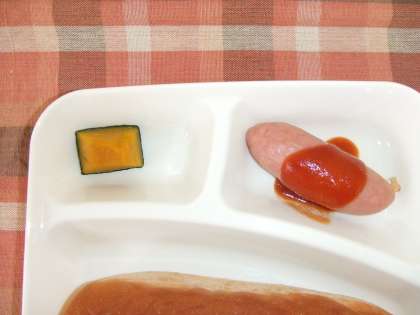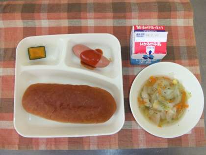9月20日(木)の給食はフランクフルトのケチャップソース、スープ、焼きかぼちゃ、パン、牛乳です。フランクフルトのケチャップソースはゆでたフランクフルトにケチャップソースがかかっています。スープはチキンスープの中に鶏肉、キャベツ、コーンが入っています。パンによく合うメニューでおいしかったです。ごちそうさまでした。