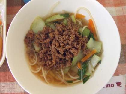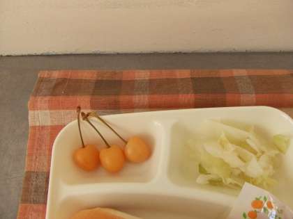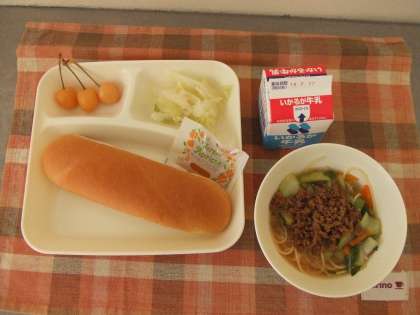 10月3日(水)の給食はタンタンメン、キャベツの甘酢漬け、さくらんぼ(缶)、パン、牛乳です。タンタンメンはしょうゆ味の中華そばにチンゲン菜、白ネギが入っています。その上に味噌で甘辛くいためた牛豚ミンチをのせます。とてもおいしかったです。ごちそうさまでした。
