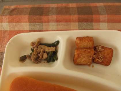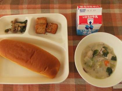 10月22日(月)の給食は白菜のクリーム煮、あつあげのごましょうゆかけ、豚肉と三度豆のオイスターソース炒め、パン、牛乳です。白菜のクリーム煮は鶏肉、チンゲン菜、ニンジン、たまねぎが入っています。あつあげのごましょうゆかけは甘辛く味付けしたあつあげにゴマが添えてあります。豚肉と三度豆のオイスターソース炒めは炒めた豚肉と三度豆を濃い口醤油とオイスターソースで味付けしています。どれもおいしかったです。ごちそうさまでした。