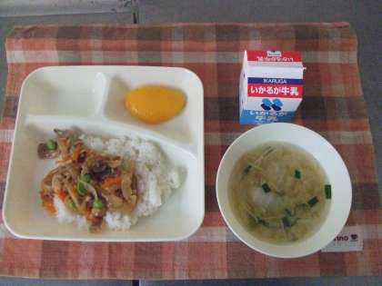 10月23日(火)の給食はピリ辛丼、中華スープ、黄桃(缶)、米飯、牛乳です。ピリ辛丼は豚肉、タケノコ、玉ねぎ、にんじんを赤みそ、トウバンジャンで甘辛く味付けしてあり、ごはんにかけて食べます。中華スープは鶏肉、もやし、はくさい、えのきが入っています。どれもおいしかったです。ごちそうさまでした。