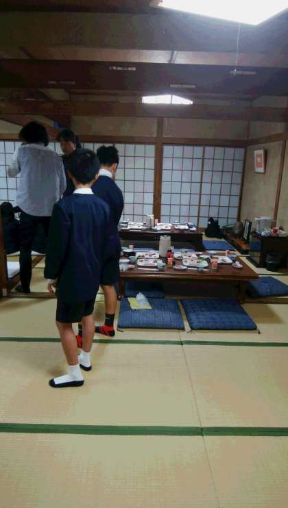 おはようございます。修学旅行二日目の朝をむかえました。天気は曇り、気温13℃、少し肌寒い朝です。子ども達は元気に朝ごはんを食べています。