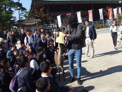 宮島での様子です。鹿が乱入してきました。子どもたちの笑顔が素敵です。
