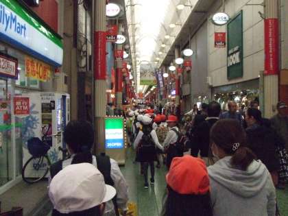 11月2日(金)「大阪くらしの今昔館」へ社会見学に行った様子です。ホールでお弁当を食べて天神橋筋商店街通って帰っています。長い商店街、いろいろな商品が並んでいました。