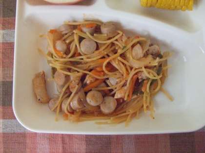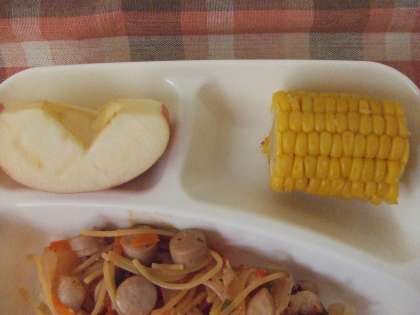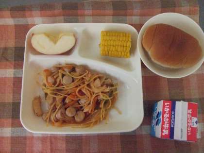 11月15日(木)の給食はチキントマトスパゲッティ—、焼きトウモロコシ、リンゴ、パン、牛乳です。チキントマトスパゲッティ—、は鶏肉、ウインナー、玉ねぎ、にんじん、ピーマン、トマトが入ったにんにくの香りがするおいしいスパゲッティ—です。焼きトウモロコシは甘味のあるコーンです。どれもおいしかったです。ごちそうさまでした。