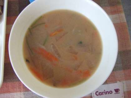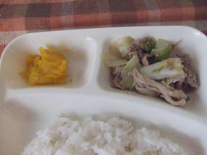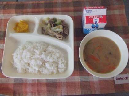 11月19日(月)の給食は豚肉とまいたけの炒め物、つみれ汁、かぼちゃういろう、米飯、牛乳です。豚肉とまいたけの炒め物は豚肉、まいたけ、キャベツが入っています。つみれ汁はイワシのつみれ、にんじん、ごぼう、だいこんが入っています。どれもおいしかったです。ごちそうさまでした。