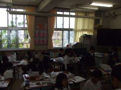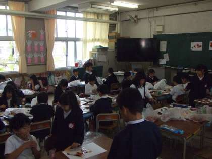 11月27日(火)1年生は白鷺公園まで秋を見つけに行きました。色とりどりの落ち葉で各自が作品を作っています。写真は1組の様子です。