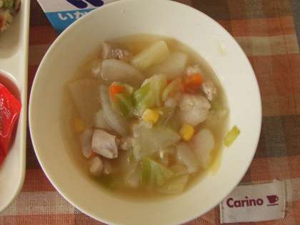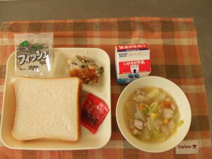 12月4日(火)の給食は鶏肉とじゃがいものスープ煮、きのこのドリア、ミニフィッシュ、パン、牛乳です。鶏肉とじゃがいものスープ煮は鶏肉、にんじん、だいこん、じゃがいも、キャベツ、コーンを薄口醤油のチキンスープで煮ています。きのこのドリアはたまねぎ、シメジ、エリンギ、マッシュルームが入って中にご飯がしっかり入っています。とてもおいしかったです。ごちそうさまでした。