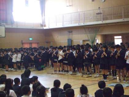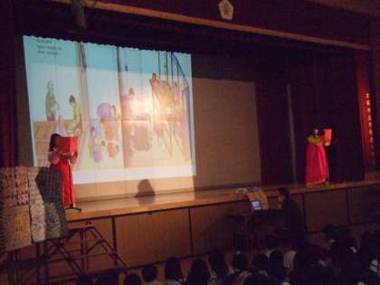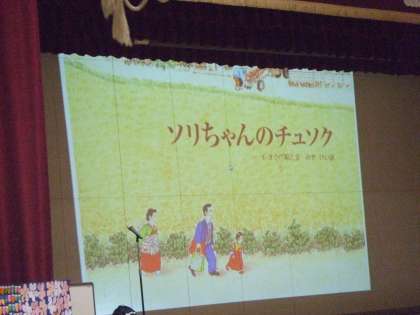 11月5日(水)ホドリの会発表会を行いました。上の写真は5、6年生の応援メッセージと「アリラン」をリコーダーで演奏しています。中と下の写真は絵本の読み聞かせです。