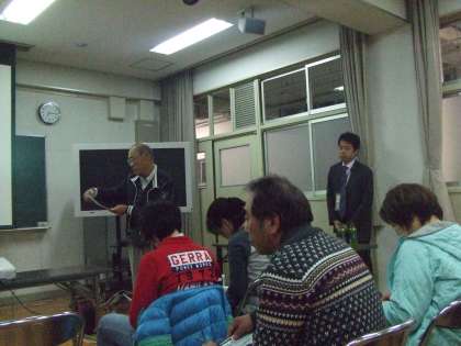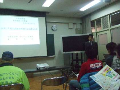 12月5日(水)多目的室で平野西地域防災会議が行われました。PTA・保護者の皆様、地域防災リーダーの皆様、地域の皆様に平野区役所の防災担当の方より「平野西地域基礎講座(水害編)」〜台風、大和川流域の水害にどう備えるか〜というもとにお話をいただきました。