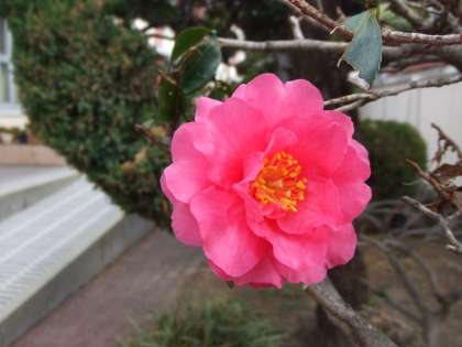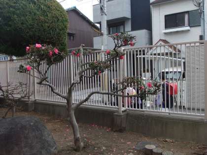 12月14日(金)今日は天気は良いのですが朝から冷え込んで冬らしい気候です。校門を入って右に椿がきれに花を咲かせています。