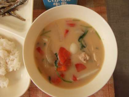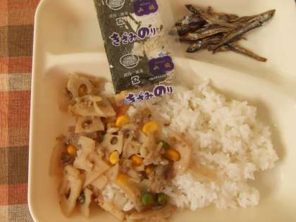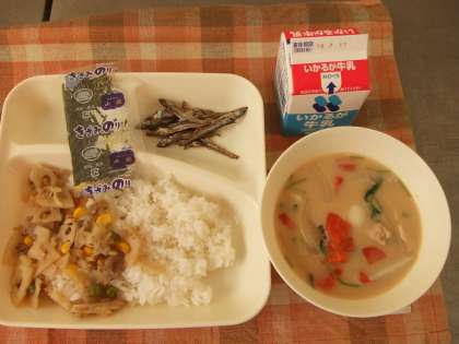 1月8日(火)の給食は正月の行事献立です。レンコンのちらしずし、雑煮、ごまめ、米飯、牛乳です。レンコンのちらしずしはレンコン、かんぴょう、しいたけ、豚肉、グリンピース、コーンが入っていてご飯に混ぜてきざみのりをふりかけて食べます。雑煮はサトイモ、鶏肉、金時ニンジン、大根に白玉もちが入り白みそ仕立てです。ごまめはこうばしい甘辛味です。今年初めての給食、どれもおいしかったです。ごちそうさまでした。