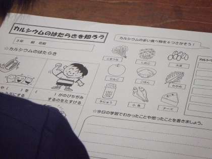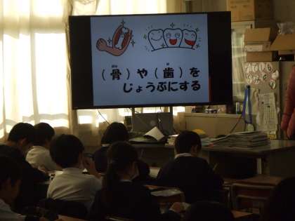 1月24日(木)3年生、食育の授業です。カルシウムについて勉強しています。子どもたちは楽しそうに、真剣に授業を受けていました。