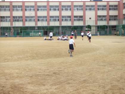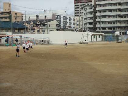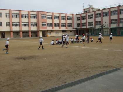 2月8日(金)4年生は体育で持久走を行っています。運動場を10周走っています。