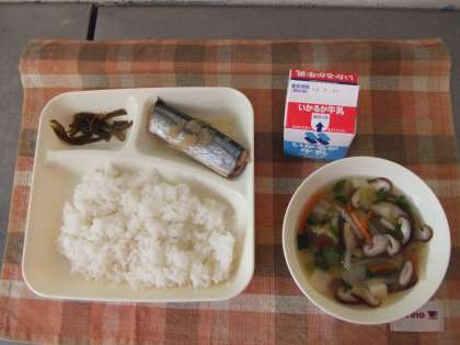 2月14日(木)の給食はさんまのみぞれかけ、すまし汁、茎わかめの佃煮、米飯、牛乳です。給食はさんまのみぞれかけは焼いたさんまにあっさり醤油で味付けした大根おろしがかかっています。すまし汁はにんじん、たまねぎ、とうふ、白菜、シイタケが入っています。茎わかめの佃煮もおいしかったです。ごちそうさまでした。