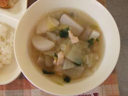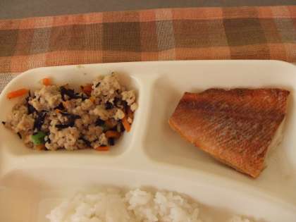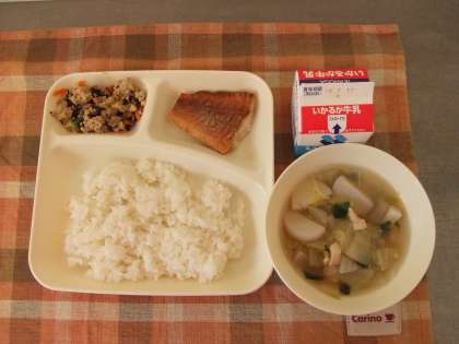 2月25日(月)朝から暖かく春の到来を思わせる陽気です。そんな今日の給食は赤魚のレモン醤油かけ、うすくず汁、高野豆腐の炒り煮、米飯、牛乳です。赤魚はさっぱりレモン風味でおいしかったです。うすくず汁は鶏肉、大根、白菜、里芋が入ったとろみのついたすまし汁です。高野豆腐の炒り煮はひじき、豚挽き肉、にんじん、グリーンピースがはいって高野豆腐と一緒に煮ています。どれもご飯に合っておいしかったです。ごちそうさまでした。