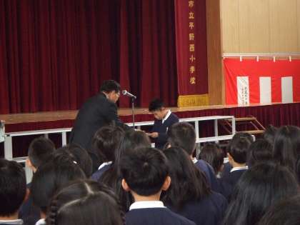 代表児童に修了証を渡しました。そして、「感謝」について、「ありがとう」についての話をしました。