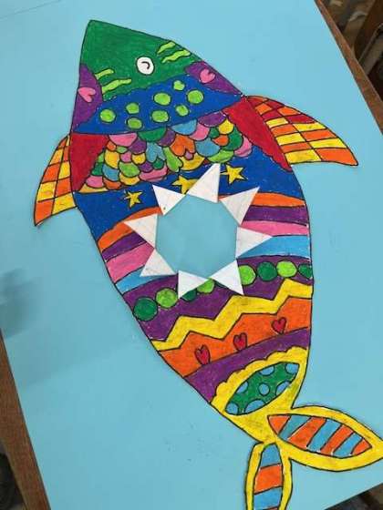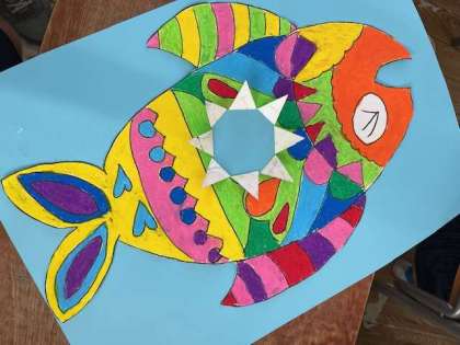 丁寧にパスで塗りこんだ魚に切り込みを入れて台紙に貼っていました。