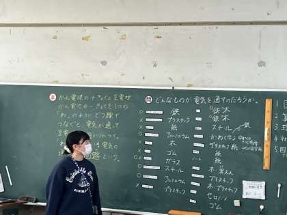 「電気を通すもの・通さないもの」の実験にむけて、予想をしていました。