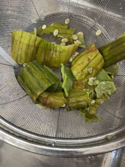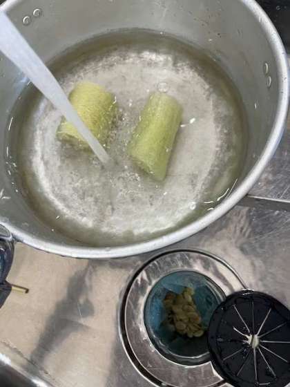 家庭科室で、ヘチマの実から「たわし」を作っていました。
