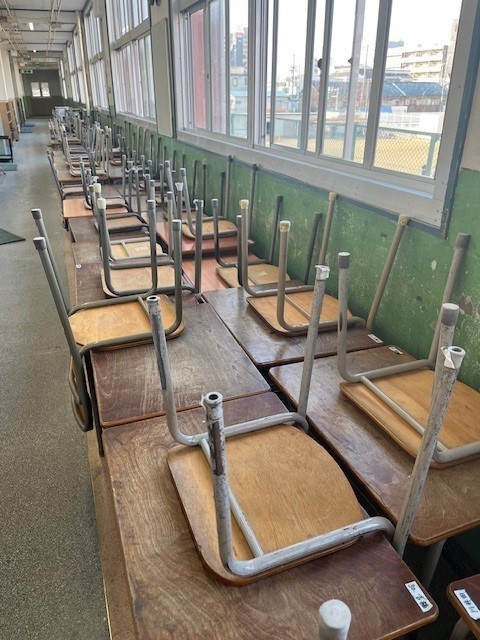 …と2階にあがると、3年生の廊下には机と椅子がビッシリ(写真)!