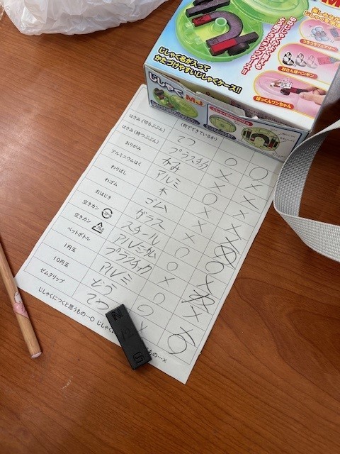 「じしゃくにつくもの・つかないもの」の実験をしているところでした。