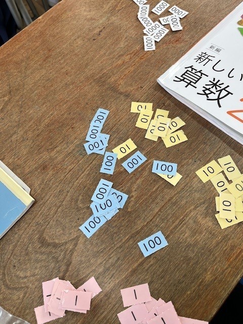 数のカードを使って、一の位から十の位へ、十の位から千の位へくり上がっていくことを確認していました。