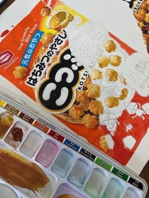 4年生では、お菓子のパッケージを切りとり、
