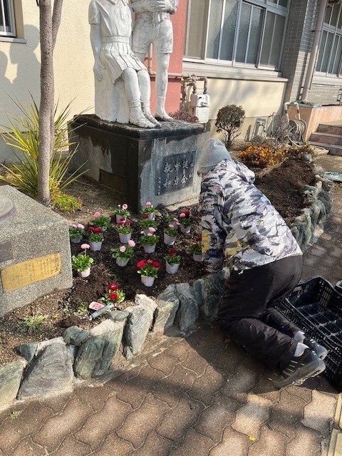 玄関では、管理作業員さんが花壇の手入れをしていました。