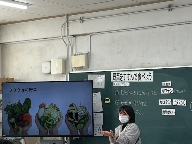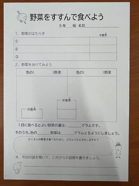 5年生、2回目の食育のテーマは「野菜をすすんで食べよう」でした。