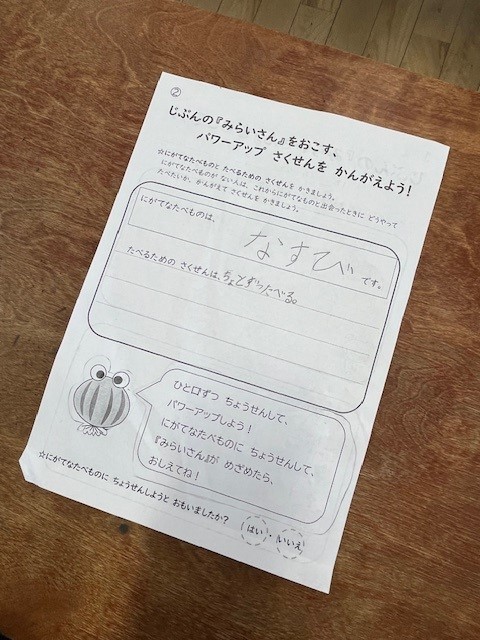 学習の後半では、苦手な食べ物にもチャレンジする方法を考えていました。