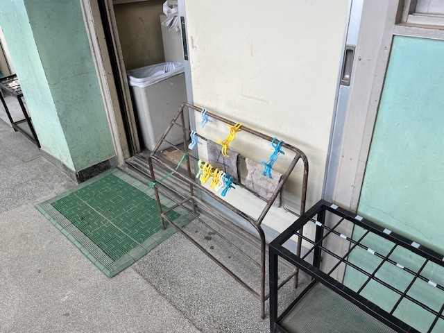 掃除が終わったころ、廊下を通ると3人の1年生がぞうきんかけをチェックしていました。