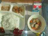 11月27日(金)の給食は豚肉と野菜のスープ煮、変わりピザ、みかん、パン、牛乳で...