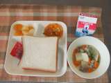 5月20日(月)の給食は豚肉と野菜のスープ煮、変わりピザ、ミックスフルーツ缶、パ...