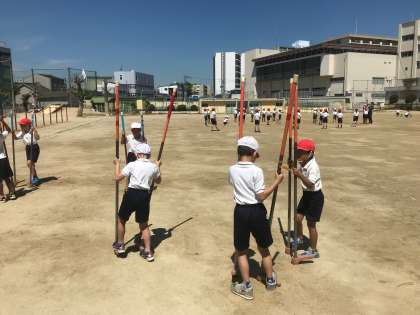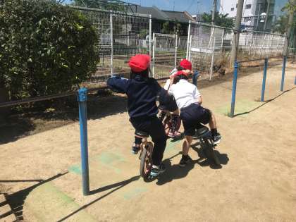 2年生では、竹馬・一輪車・フラフープ・鉄棒・遊具などを使った運動遊びをしています!