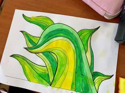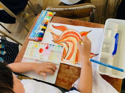 5月の図工では絵の具で混色の学習しました。水を含めると同じ色でも薄くなっていくことがわかった時に「なるほど!」と納得している子どもたちの姿も見られました。学んだことを実際に使い、二色の絵の具だけで様々な色を作り、鮮やかに塗ることができました。